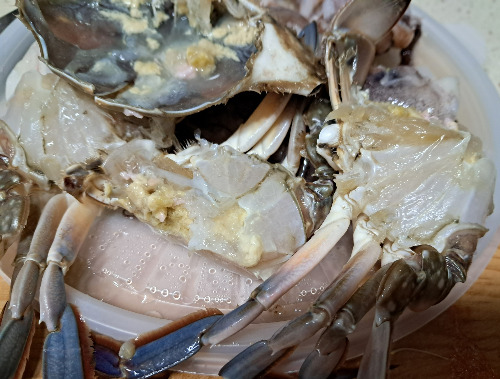 아가미를 떼내고 솔로 깨끗이 씻어냈다. 등딱지에 붙은 모래집도 떼어냈다.