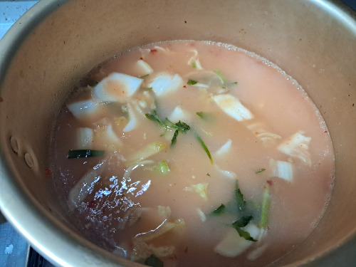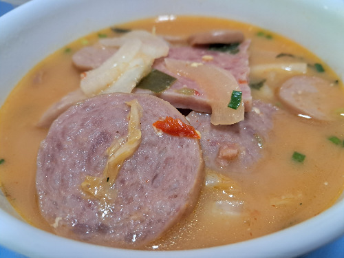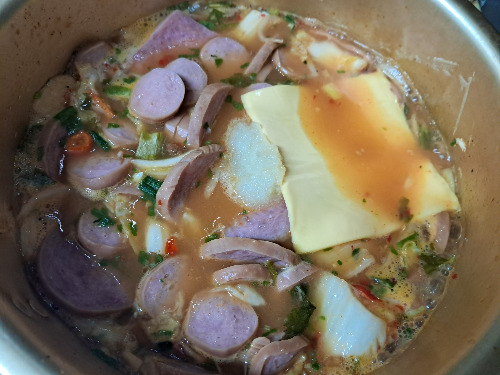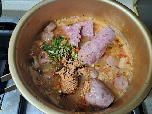꼬리곰탕 육수에 모둠햄을 넣고 부대찌개를 하려고 한다. 꼬리곰탕으로 부대찌개 끓이기에
