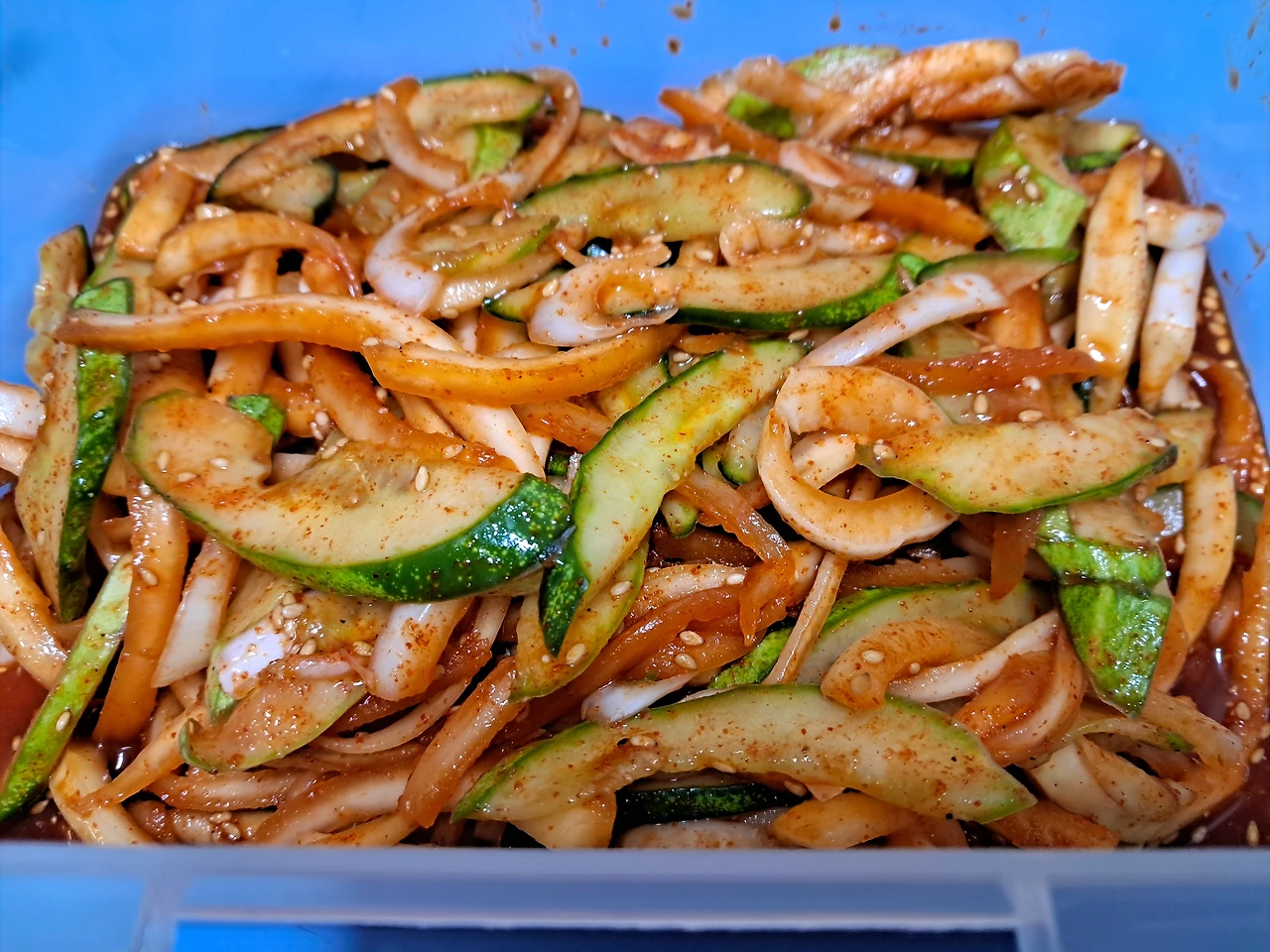 3. 도라지에 황설탕 한 스푼과 식초 한 스푼 넣고 고추장 2스푼, 고춧가루 2스푼, 설탕 1스푼, 오이,