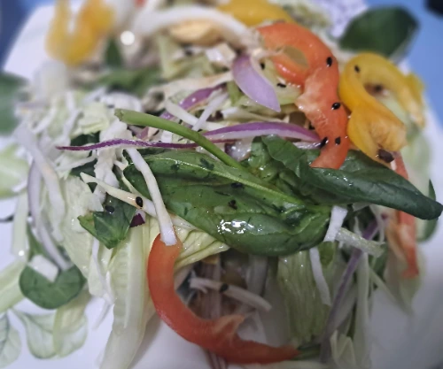 양배추, 양상추와 파프리카와 시금치를 넣고 올리브오일 드레싱을 뿌려 끼니마다 먹으려고 노력하고 있다.