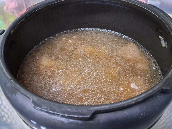 푼을 넣고 뚜껑을 덮고 압력솥에 30분 끓인다. 갈비탕이 다 끓으면 작은 압력단추를 열어 압을 빼준다.