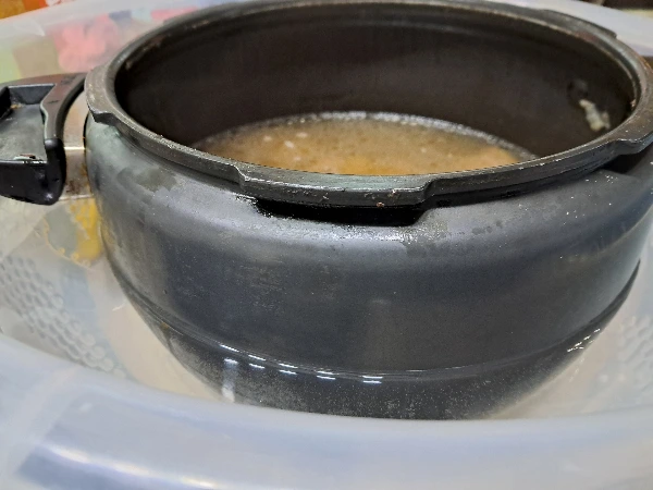 5. 찬물에 압력솥을 담가 물을 여러 번 갈아주며 식힌 후 냉동실에 넣어 기름을 굳힌 후