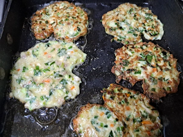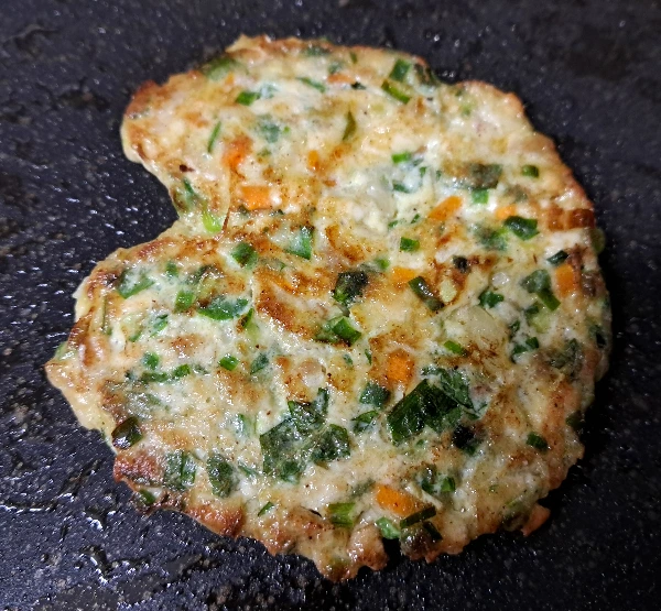 오늘 저녁은 위의 재료들을 혼합하여 1/3 양에 계란 2개와 풀어 하트전으로 만들었다.