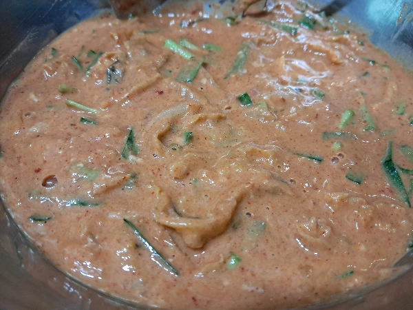 계란 2개, 썰은 김치 2컵, 자른 부추 1컵, 여주 우린 물 1/4 컵