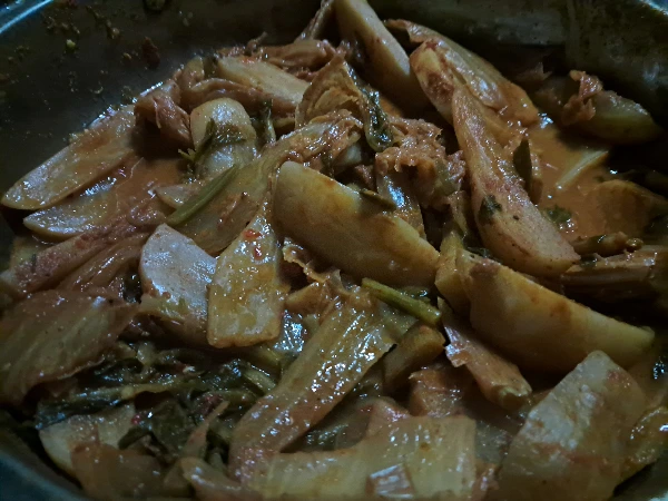 김치볶음을 시작했다. 묵은지 한쪽, 총각김치 냉면그릇 수북이 한 그릇, 들기름 반 컵, 까나리 액젓 3스푼, 김치국물 1 국자, 쌀뜨물 두 컵 반, 된장 1스푼을 넣고 센 불에 볶다 끓어서 중간 불로 줄이고 40분 끓였다.