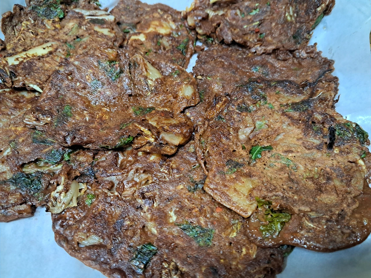 김치전을 하려는데 밀가루는 탄수화물이 많으니 제외하고 혈당과 다이어트에 도움을 주는 도토리가루, 비타민 A, C가 많이 함유되어 칼슘과 무기질이 풍부한 깻잎, 변비에 좋고 섬유질이 풍부한 묵인지를 썰어 넣고 김치전을 준비했다. 도토리가루만 넣으면 끈기가 없을 수 있으니 찹쌀가루와 혈액청수부 양파를 넣은 조합이면 보약 수준일 거 같다. 현재 100일을 정해놓고 고공행진 중인 혈당을 정상으로 끌어내리기로 작정했다.
