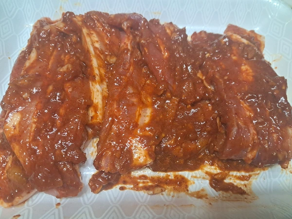 제주흑돼지 삼겹살 330g, 고추장 반 스푼, 간장 반스푼, 다진양파.1/4개, 고춧가루 0.5스푼, 홍시 1/7 개, 다진 마늘 0.5스푼, 생강가루 소량, 후추 조금, 참기름 반스푼, 맛술 1스푼, 진간장 0.5스푼