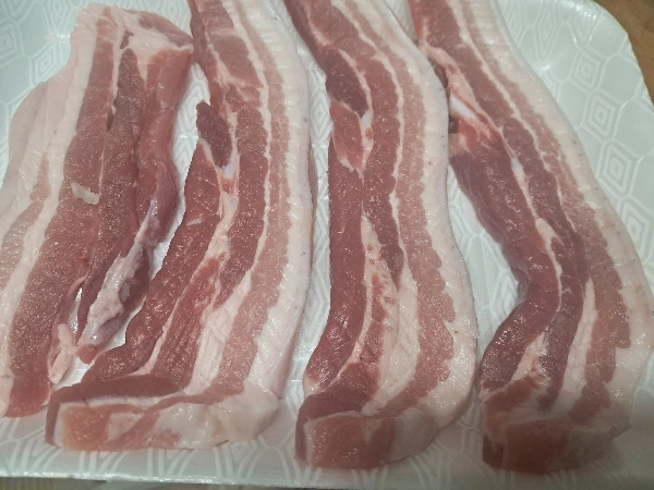입맛을 다시기에 제주 흑돼지 삼겹살을 사 왔다. 칼날로 앞뒤로 곱게 다졌다. 4조각이 330g이다.