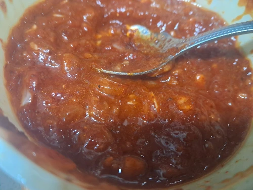 마늘과 양파, 홍시 다진 것과 고추장과 참기름, 맛술과 후추, 생강가루,