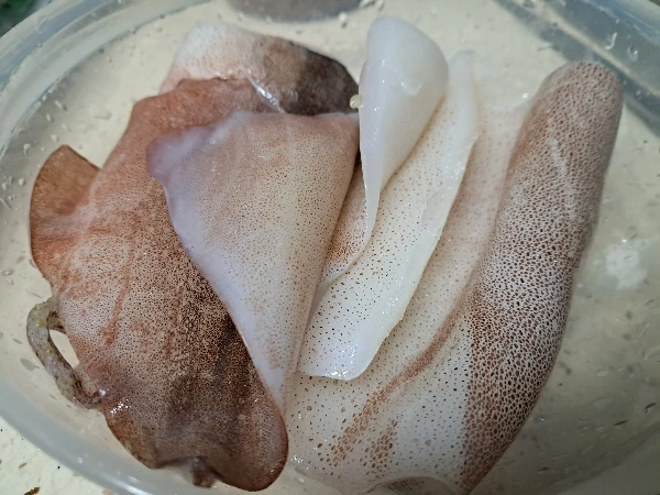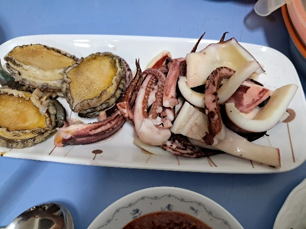 전자레인지에 물 없이 데치면 어떨까 연구해 보고 실험에 들어갔다. 오징어와 전복을 깨끗이 세척한다.