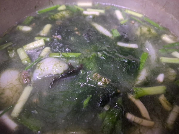 세척한 매생이는 맛술과 참기름, 국간장을 넣고 볶아주다 물을 붓고 끓인다.
