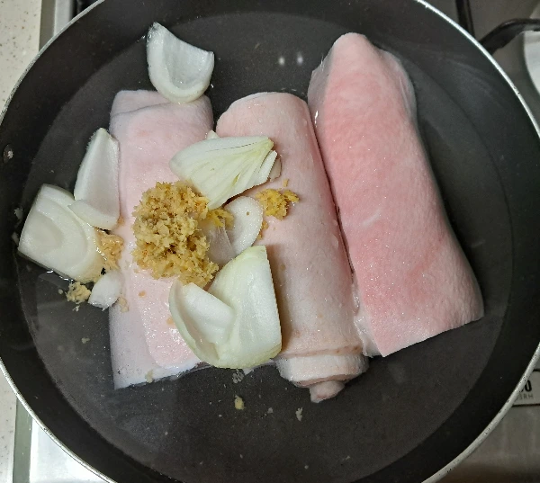 깊은 솥에 돼지껍질 둥글게 뭉친 거 세 덩이를 넣고 양파 반 개와 생강, 소금, 맛술을 넣고 20분 삶았다.