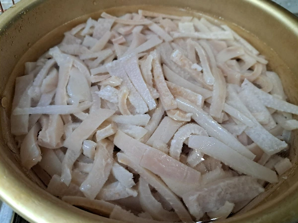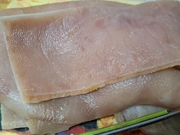 이번에는 돼지껍질의 기름은 모두 제거하고 콜라겐이 풍부한 껍질만으로 묵을 만들려고 한다.