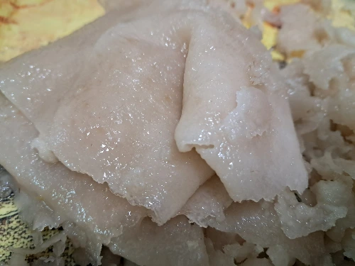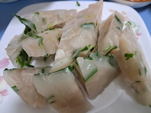 자르면 이런 상태의 콜라겐 묵이 된다. 다이어트에도 좋다. 부추가 들어가서 피를 맑게 해 준다.