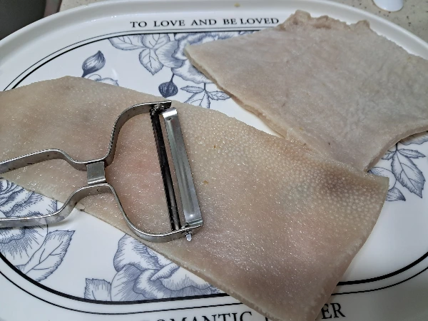넓적한 쟁반에 삶은 돼지껍질의 껍질 겉면을 감자 깎기 기기로 긁어내서 잔털과 이물을 벗겨낸다.