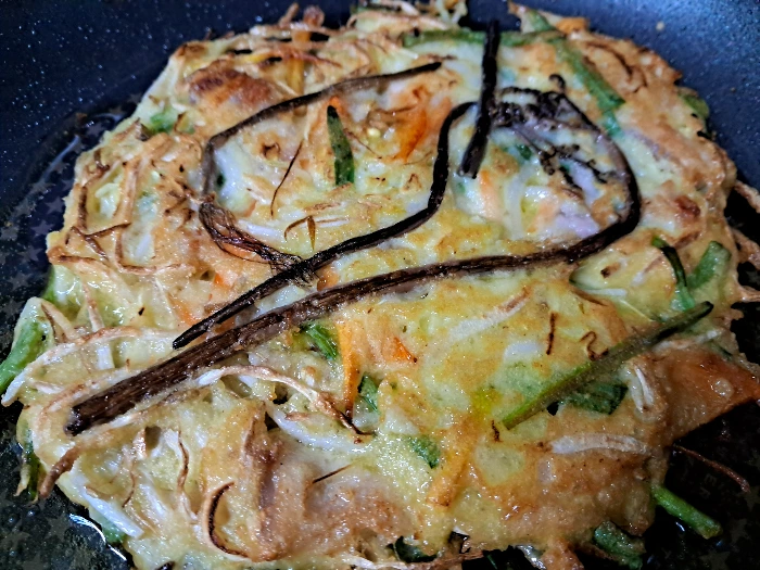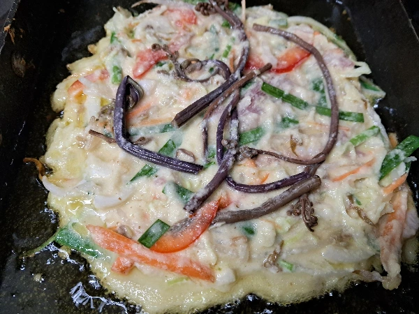 ** 채소와 녹두콩에서 흘러나온 건국물을 버리지 말고 두툼한 반죽 위에 올려준다.