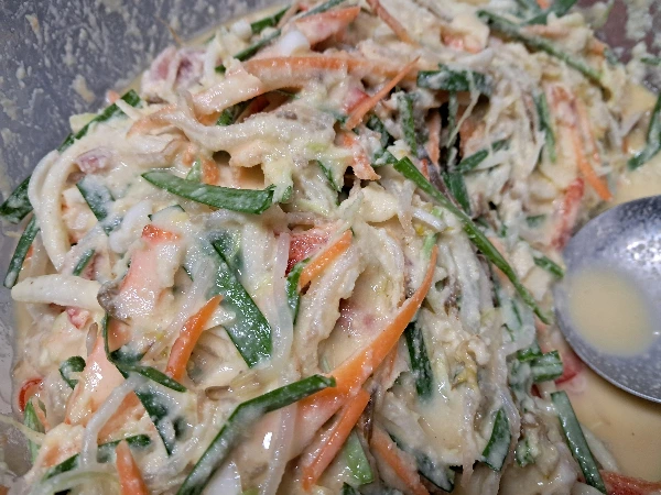 4. 찹쌀가루는 물을 섞어 풀어준다. 돼지고기는 얇게 썰어 넣고 모든 재료에 소금을 넣고 섞어준다.
