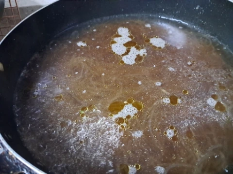 * 물이 끓을 때 불린 당면 360g 넣고 간장 30g과 올리브유를 반 스푼 넣어준다.