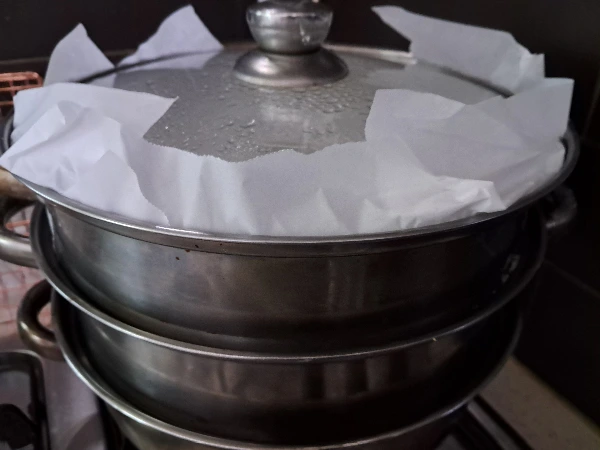 찜통 맨 아래에 물을 2/3쯤 넣고 찜통에 삼베보나 종이포일을 깔아준다. 서로 들러붙지 않게 띄어 담는다.