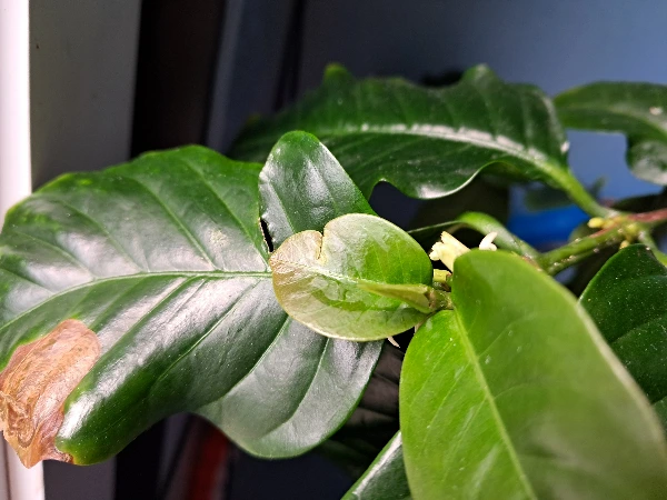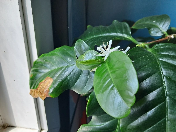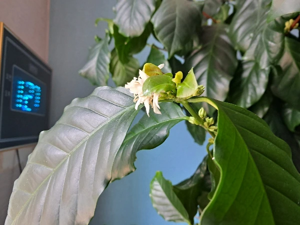 새로 핀 커피꽃이다. 한 거 번에 꽃이 피는 것이 아니고 천천히 한두 송이씩 피운다.