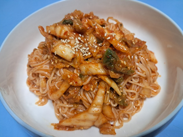 양념김치에 참기름으로 코팅한 국수를 넣고 무쳐준 후 참깨를 고명으로 올렸다.
