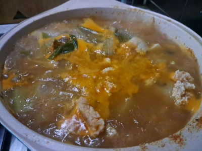 찌개가 반 정도 남았으니 새로 끓인 육수 500cc를 넣어주면 된다.