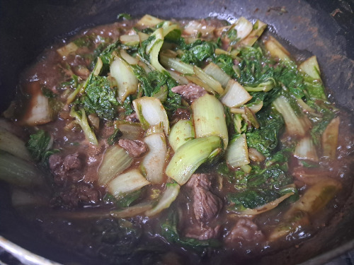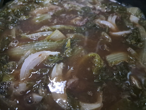 육수 반 컵을 넣고 소고기와 얼갈이배추에 된장과 고기 맛이