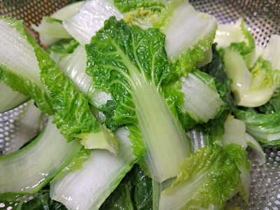 살짝 삶은 얼갈이배추를 찬물에 두세 번 세척했다.