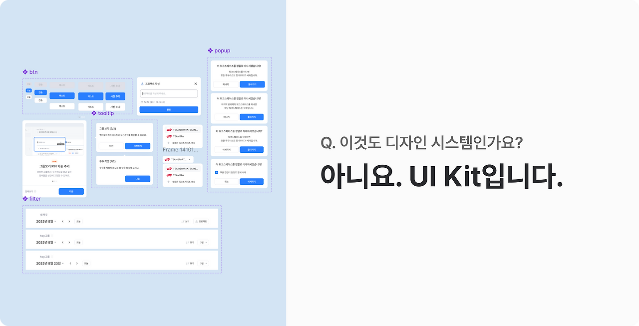 이처럼 함께 만든 기준이 있을 때는 디자인 시스템으로 볼 수 있지만 그렇지 않다면 단순 컴포넌트 모음, UI Kit로 부르는 것이 적절하다.