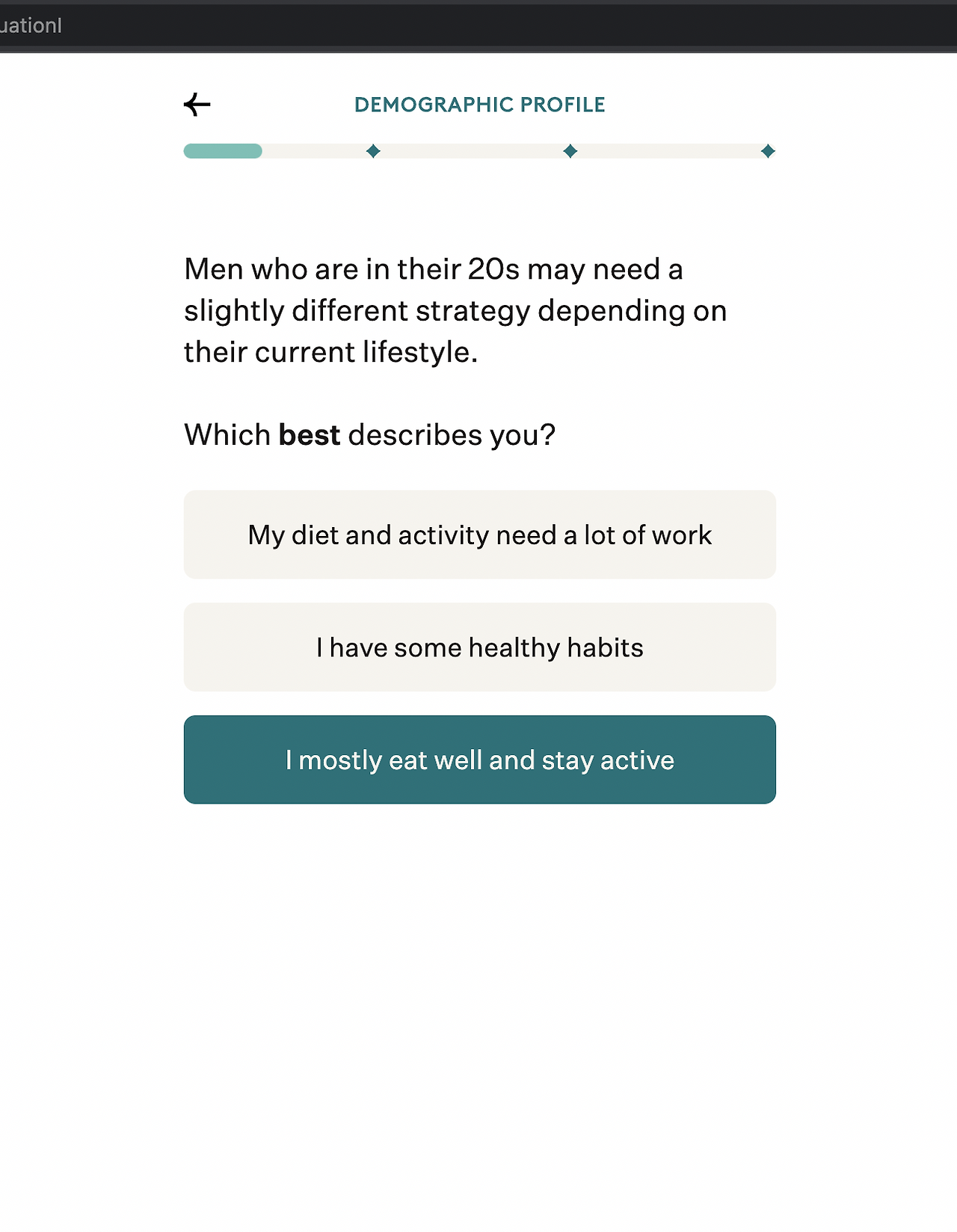 필자가 ‘20대 남성’이라고 답하니 질문에 ‘20대 남성은 현재 생활 방식에 따라 약간 다른 전략이 필요합니다. 어떤 답변이 당신을 가장 잘 설명하나요?’라고 묻고 있죠.