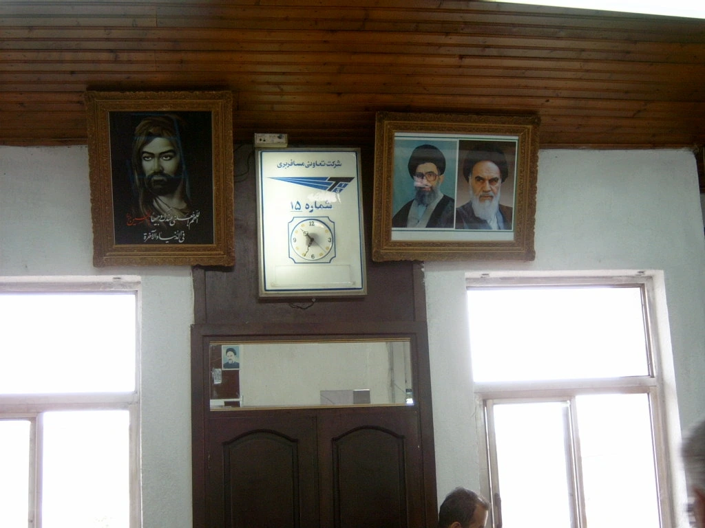 이란 머술레 고속버스 매표소 내부 사진 - 왼쪽부터 이맘 후세인, 현 종교지도자 하메네이, 호메이니(2003)