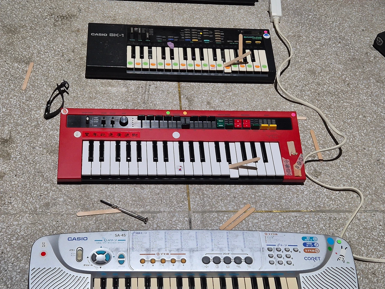중앙을 기점으로 키보드가 펼쳐져 있고, 관객은 자유로이 돌아다니며 퍼포먼스를 즐길 수 있다. 처음에는 '한 명의 아티스트가 여러 개의 소리를 어떻게 동시에 낸다는 거지?'라고 생각했는데, 이렇게 막대를 꽂아 소리를 고정시켜 두는 방식으로 진행된다.