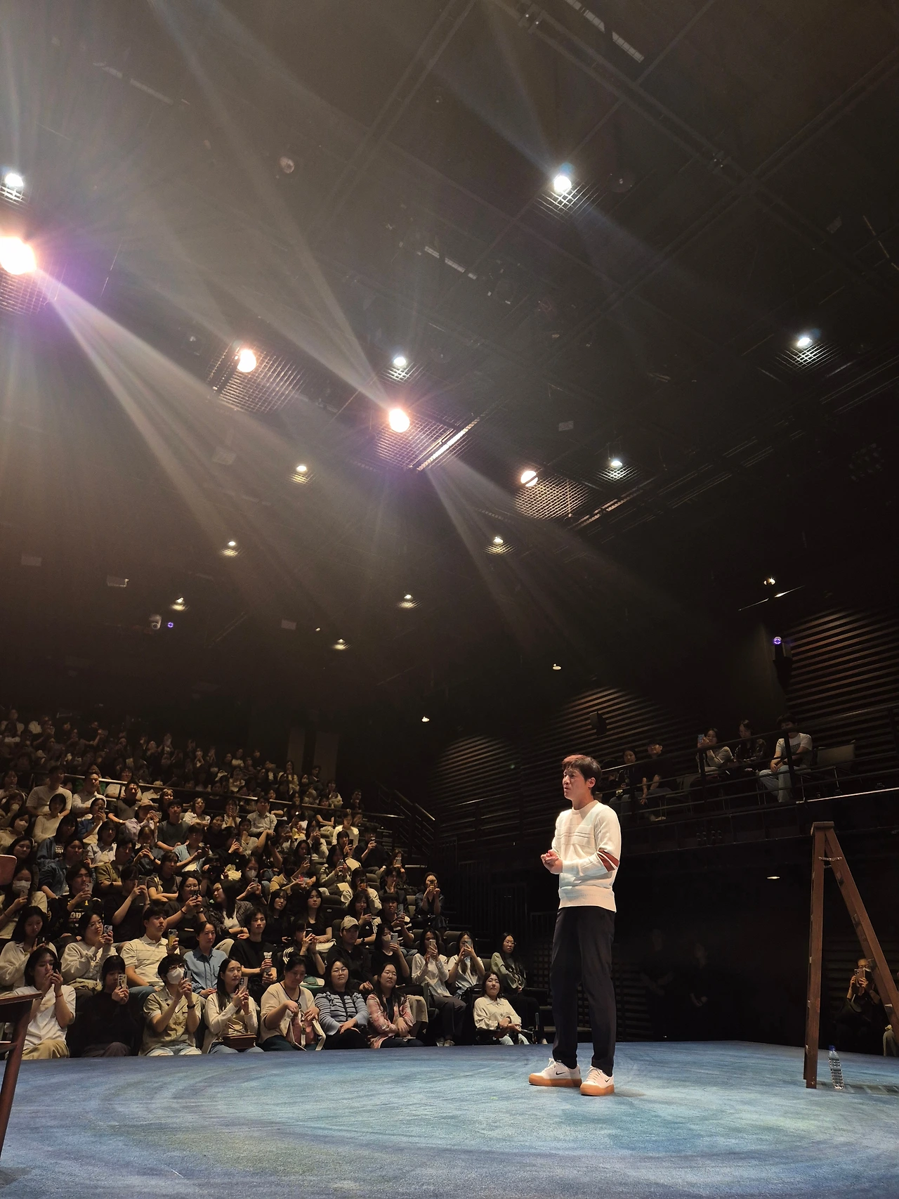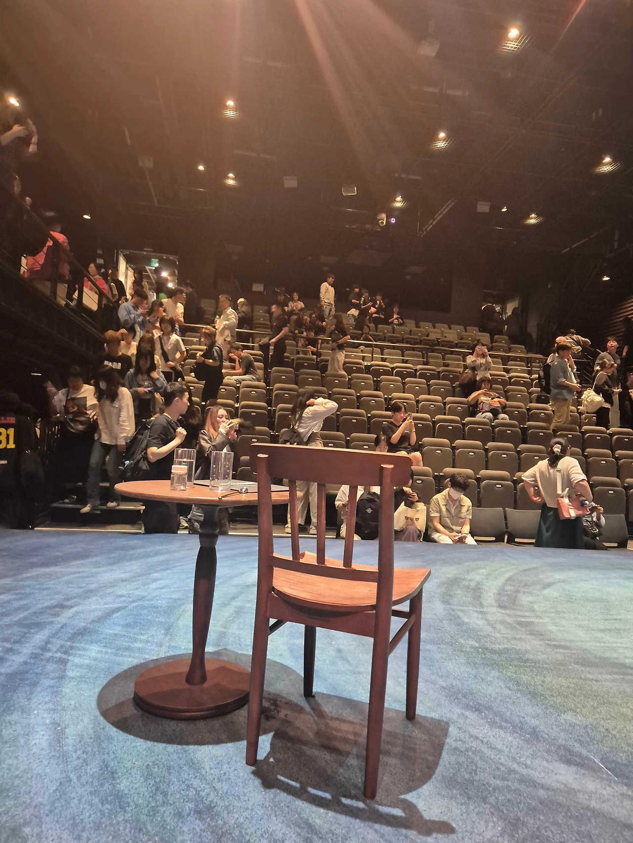 원형 극장 위에 사다리, 의자, 테이블, 물병 등이 준비된 채로 비움의 미학이 느껴지는 세트였다. 간혹 원형으로 둘러앉아 관람하는 극을 보는데, 특히 이 극은 관객의 참여로 이루어지기에 사람들의 표정을 보는 것이 재미를 더했다.