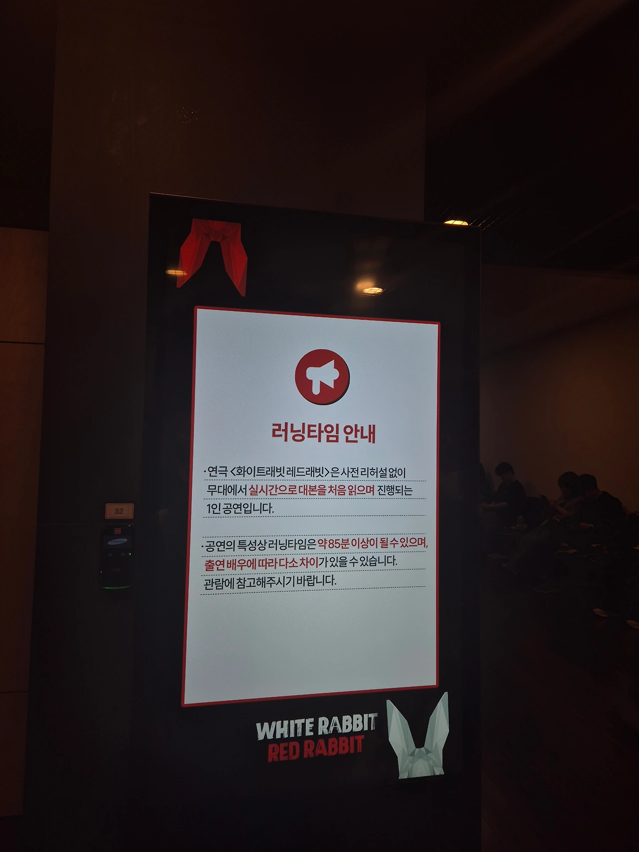 연기에 내공이 깊은 배우가 이끄는 걸 보고 싶었다. 처음 연출가분께서 극에 대해 간단히 소개하시고는 들어가는데, 배우가 한 번도 무대의 모습이나 어떤 이야기인지 등을 본 적이 없다고 하셨다. 진짜로 바로 하는 것이 흥미를 끌기에 좋았다. 대본에 없는 말이더라도 재치 있게 풀어내는 대사들이나, 관객의 참여를 유도할 때 자연스러워서 이 배우님으로 보길 잘했다고 생각했다.