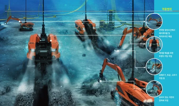 3가지 모델은 작업에 따라 분류됩니다. 먼저 경작업용 ‘URI-L’은 최대 2500m 수심에서 수중환경조사나 수중 구조물 시공 및 작업 지원, 유지 보수 등 경작업을 할 수 있습니다. 그리고 중작업용 수중건설로봇 ‘URI-T’는 최대 2500m 수심에서 해저 케이블을 매설하거나 중량이 큰 구조물을 설치할 수 있는데요. 최근 개발한 ‘URI-R’은 트랙기반 중작업용 로봇으로 최대 500m 수심의 단단한 지반에서 파이프라인을 매설하거나 암반 파쇄, 지반 고르기 등의 작업을 수행한다고 합니다.