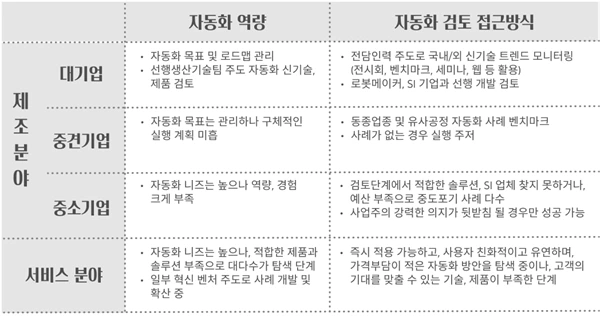 전통적으로 로봇은 대기업과 중견기업에서 주로 사용해 왔고, 여전히 전체 수요의 80% 이상을 대기업과 중견기업이 점유하고 있습니다. 그러나 최근 사용하기 쉽고, 유연하며, 가격경쟁력을 갖춘 다양한 로봇과 솔루션들이 크게 증가하며, 중소기업과 서비스 분야까지 저변이 빠르게 확대되고 있습니다.