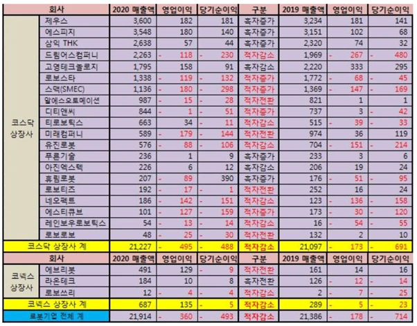로봇신문에서 분석한 로봇 상장 기업들의 전년도 실적을 보면 대다수가 매출규모나 수익성 측면에서 아직도 크게 열악한 상황임을 알 수 있습니다.