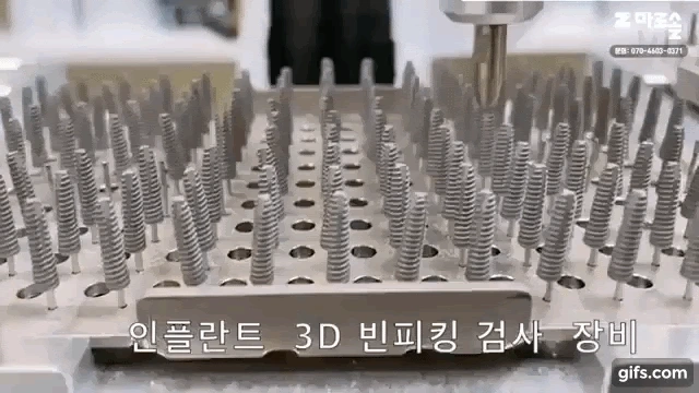 위의 이미지를 보시면 1초 동안 빠르게 빛이 번쩍이는 순간이 있죠? 로봇이 동작하면서 동시에 3D비전으로 1초만에 임플란트를 스캐닝해 빠른 속도로 작업을 수행할 수 있었습니다. 속도가 생명인 생산 공장에서 빠르고 정확한 품질 검사를 통해 사이클타임도 단축하고 일석이조입니다.