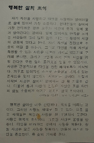 자기 자신을 사랑하고 타인을 사랑하는 일이야말로 삶에 있어서 가장 소중하다. 현대인들의 삶에서 가장 안타까운 것은 모두가 시간에 쫓겨, 일에 쫓겨 살아간다는 것이다.