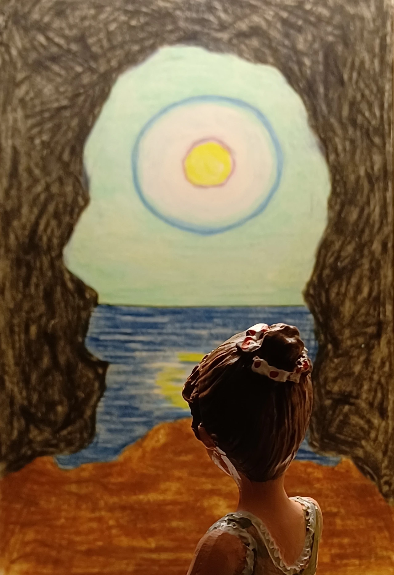 서서히 밝아오며 하늘 위에 해가 자태를 드리웠다. 한편 바다는 무더위 속에서 열기를 끌어안았다. 해면에서는 수많은 아기 물방울들이 하늘로 솟아오르고 창공을 채우며 더욱 열기를 높여주고 있었다. 동굴 안에는 바람조차 멈춰버리고 열기만 가득해져 가지만, 소녀는 엄마 동굴에 앉아서 의연하게 해의 자태를 바라보고 있었다.