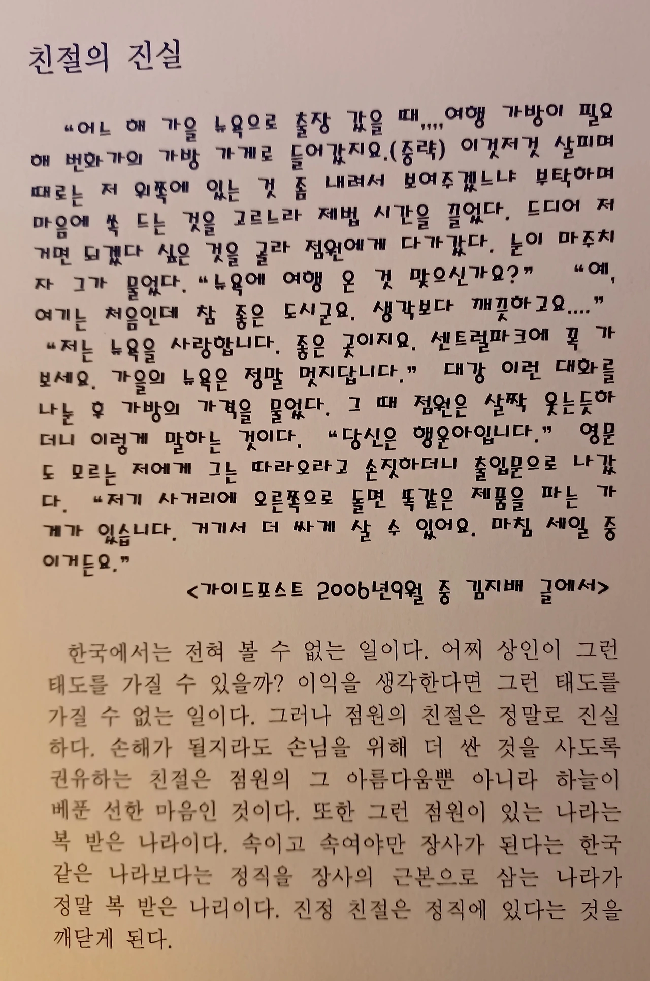 참으로 오래전에 글입니다. 미국 여행을 기다리고 기다리다가 부친께서 하늘나라에 가신 후.. 다음 해에 드디어 미국 여행을 계획했지요. 자녀들과 함께 떠난 미국 여행.. 첫 하와이에서 호텔 식당에서 식사하는데 노인이 커피를 내려 가져다주시어 당황했어요. 직원에게 물어보니.. 채용할 수 없어 서비스 봉사를 하여 팁으로 생활을 한다고 해요. 그래서 팀을 드렸지요. 더 놀란 것은 1달러 지폐나 동전에 있는 문구였지요. "IN GOD WE TRUTH"(하나님 안에 우리는 정직하다).. 이것이 미국 건국 정신이구나? 감격했어요. 그리고 정기 구독한 가이드포스트에서 감동의 글을 읽었어요. 그래서 지인들에게 엽서로 나누었지요. '친절의 진실' 다시 꺼내어 읽어도.. 그때처럼 제 마음을 뜨겁게 하네요. 정직은 장사의 근본으로 삼는 나라... 지금은? 더욱 마음을 슬프게 하네요. 영어가 얼마나 정직한 언어인지 아시나요? 주어와 동사가 먼저 말해요... 하나 한글엔 주어와 술어.. 그리고 맨 뒤에 동사가 오네요.. 그래서 어느 교수가 이렇게 말했어요. 우리말은 끝까지 다 들어야 한다고요.. 슬퍼요~ 거짓의 온상이 거기에 있음을요.