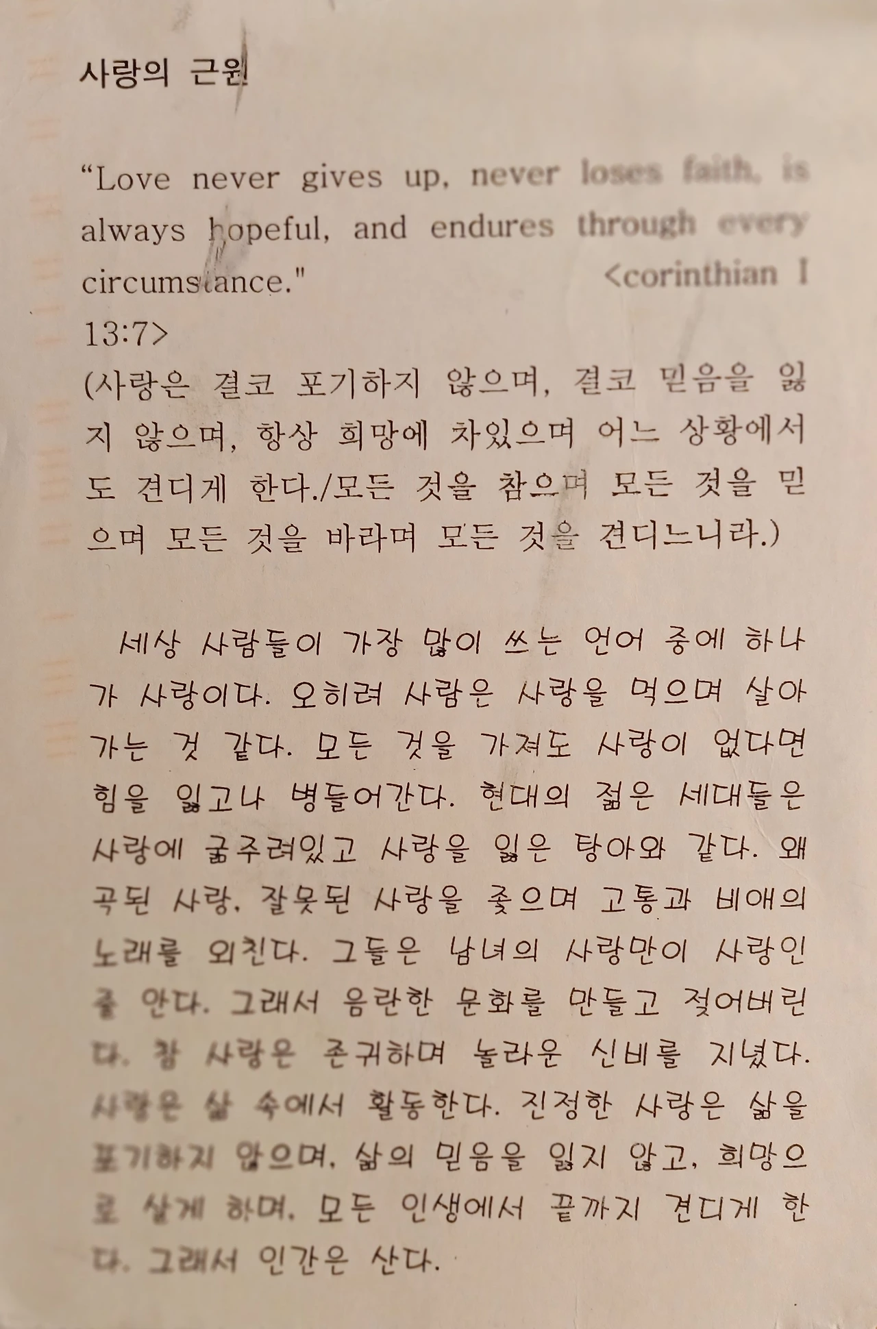 사람들이 가장 좋아하고 즐기며 흔한 단어가 사랑일 게다. 영화나 소설에서도 빠질 수 없는 장면들이 사랑일 게다. 그런데.. 왜? 그들은 힘들어하고 괴로워하며 그토록 사랑을 외치며 몸부림칠까? 그것은 사랑이 아니기 때문이다. 대중가요에서도 많이 인용하는 말이 사랑 사랑.. 그런다. 그들은.. 사랑에 몸부림치는 인간들은 환상적인 사랑, 또는 가식적인 사랑, 또는 탐욕적인 사랑을 감추고 있는 게다. 가슴이 뛰면 사랑이라고, 몸이 뜨거우면 사랑이라고, 마음이 흥분되면 사랑이라고... 그러나 짐승보다 못한 인간일 뿐이다. 짐승이 사랑하냐? 식물이 사랑을 느끼냐? 참으로 무지하기 짝이 없다. 암수가 흥분하는 걸 사랑? 하물며 섹스까지 동물에서 배우는 인간들.. 진정한 사랑을 뭘까? 사랑은 생명을 살리는 거룩한 것이다. 그중에 유일한 모성애가 바로 참 사랑의 그림자이다. 그래서 모든 인간은 그 어머니의 사랑을 못 잊는 게다. 인간은 결코 참 사랑을 알 수 없다. 단지 여성을 통해서 모성애를 통해 이해할 뿐이다. 천지가 그 사랑의 능력으로 창조되었고, 그 사랑은 지금도 천지를 다스리고 보살피며 치유케 하신다. 그 사랑을 보여주고 알게하는 것이 바로 어머니의 사랑인 게다. 그러므로 어머니의 날을 통해 그 사랑을 다시 되돌아보아야 할 게다. 천지를 보아라! 무엇이 수 많은 생물을 돌보시는지를...그것이 사랑이시다. Therefore God is Love. So mother's love is the shadow of God's Love.