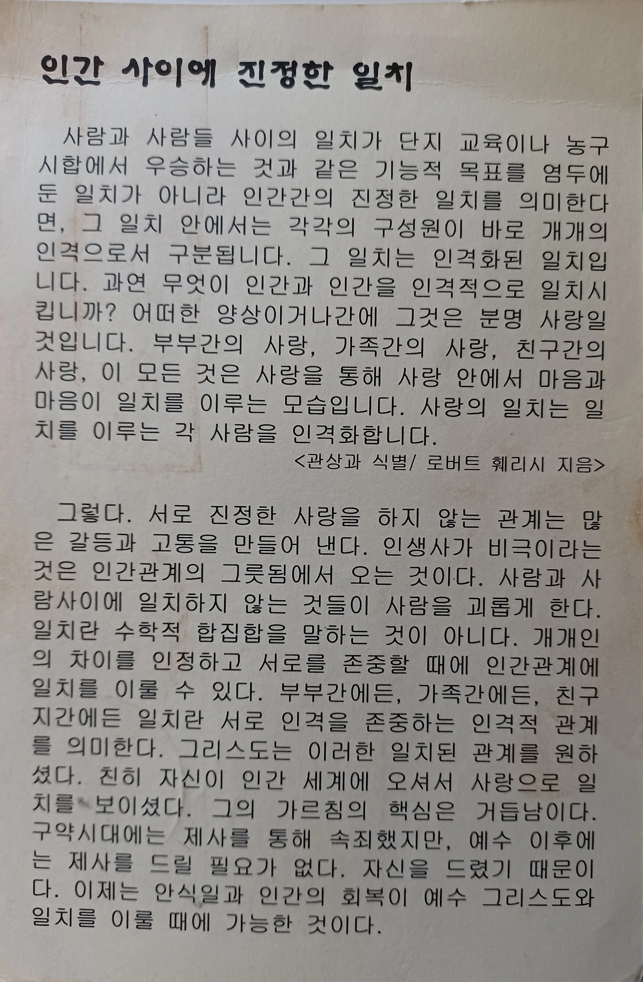 인간관계에 있어서 일치성은 무엇일까? 또 어떤 관계여야 바른 관계를 유지할까? 어찌 보면 인간 세계란 이러한 관계성에서 오는 갈등의 역사였으리 생각하게 된다. 참으로 이해할 수 없는 것은 인간 갈등이다 왜 인간들에게서 끝없는 갈등을 야기하며, 인간 비극을 생산하는가? 어느 교수의 말이다. 인간들은 둘 이상 모이면 정치를 하게 마련이다. 그러면서 일반적 정치를 말하는 것 같다. 그러나 꼭 그렇지마는 아니다. 그렇게 말하는 교수 역시 진실한 말을 한 거라고 믿지 않기 때문이다. 인간사회의 기본이 되는 가정이란 곳에서도 갈등은 있다. 그러니 더 큰 집단인 마을, 국가 등에선 더욱더 갈등이 유발할 수밖에 없다. 이러한 갈등은 인간들 사이에 진정한 일치를 이루지 못하기 때문이다. 어떤 교육기관, 어떤 운동경기, 어떤 이념으로 이룬 집단, 국가에 있어서는 교육이나 훈련 또는 이념이나 사상으로 구성되었다고 해도, 또는 같은 기능적 목표에 일치를 가진다 해도 절대로 진정한 일치를 이룰 수도 없고 유지할 수도 없다. 그 이유는 진정한 일치를 의미하지 않기 때문이다. 그러나 유사한 일치가 있다면, 그것은 부부관계, 부모관계, 가족관계, 친구관계 등을 살펴볼 수가 있다. 그러한 관계에는 사랑, 우정 등이 있음을 알게 된다. 그러므로 진정한 관계의 일치성은 '사랑'이라고 말할 수 있겠다. 참다운 사랑에는 서로를 존중하는 인격적 일치임을 알 수 있다.