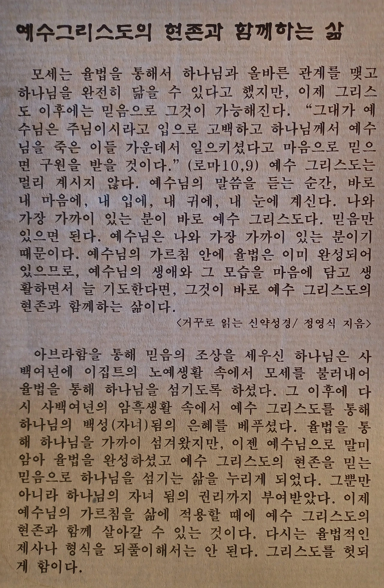 사람들은 누구나 사실을 확인하려는 본능을 외면하지 않는다. 어떤 소문이든, 특히 요즘엔 더욱 폰과 인터넷 등을 통해 거리와 상관없이 많은 화재를 접하며 산다. 한때 지구촌이란 신용어가 유행할 정도로 인간관계가 가까워진 세상이 되었다. 그러다 보니 사실 확인조차 해야 할 겨를이 없는 시대에 산다. 한편으로 다양한 영상문화로 더욱 불확실한 세계에 사는 편이다. 최초로 현대 물리학에서 시작된 불확정성이란 용어가 경제, 정치, 사회에 유행처럼 이념으로 생산되면서 더욱 불확실성 속에 현대인은 살고 있다. 이런 시대에 "현존하는 예수"라는 진리를 이야기한다는 것은 매우 어려워졌다. 그러나 다행스럽게도... 이스라엘 국가가 실존함으로 성경에 대한 화재가 상당히 신뢰성을 가질 수가 있게 되었다. 이러한 배경 속에서 역사적 근거와 현존하는 기독교 교회가 많은 힘을 실어주게 되었다. 이런 예수의 복음을 진리로 믿음으로 묵상을 할 수가 있었다. 추상적이거나 허상적인 진리가 아니라 사실임을 믿기에 좀 더 확실한 믿음이어야 하겠다. 그것은 예수가 과거적 인물이 아니라 현존하는 분이라는 것을 말할 수 있다. 여전히 예수를 부정하는 이스라엘인은 오직 율법주의를 주장하지만, 예수복음도 역시 역사적 배경을 갖고 있을 뿐만 아니라 현존하시는 분이란 것을 말하고 싶다. 그런데 일부 기독교(가톨릭과 개신교)에서는 율법과 복음의 이중성을 주장하면서 여전히 율법적 제사와 형식을 버리지 못하고 있다는 것이다.