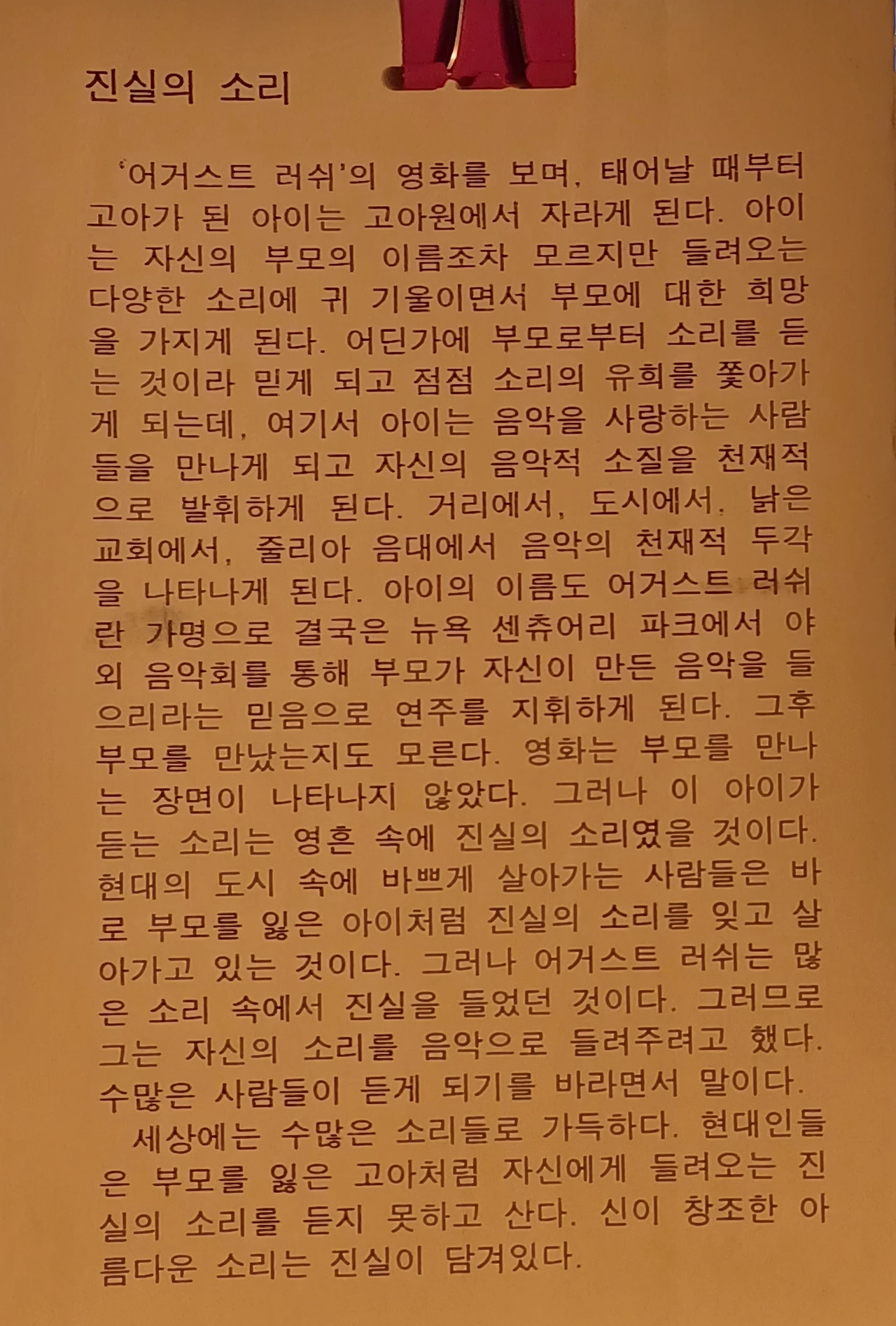 참 오래전에 의정부 신세계백화점에 있는 CGV에서 본 영화, '어거스트 러시'를 다시 엽서로 읽게 되니 절로 눈물이 난다. 그 아이처럼 우리도, 나도 역시 이 세상에서 고아와 다를 게 없다. 부모의 이름조차 모르면서도 그리워하며, 애타게 외치는 소리... 그 진실이 아름다운 노래로 세계에, 저 하늘에 들려지기를 바라는 마음이 어찌 눈물 없이 들을 수 있을까? 산길을 걸으며 나무숲 속에서 들려오는 아름다운 새소리.. 깊은 밤에 뒤뜰에서 울려오는 귀뚜라미 소리.. 거기에도 진실의 아름다움이 있다. 어찌 그 진실한 소리를, 그 진실한 노래를 듣지 아니하겠는가? 저 하늘에 창조주 아버지가 듣고 계신다. 밤하늘에 달도, 새 아침에 떠오르는 해도 그 은혜를 말하니, 고아처럼 사는 사람에게서 진실의 노래를 귀 기울 이 신다네.