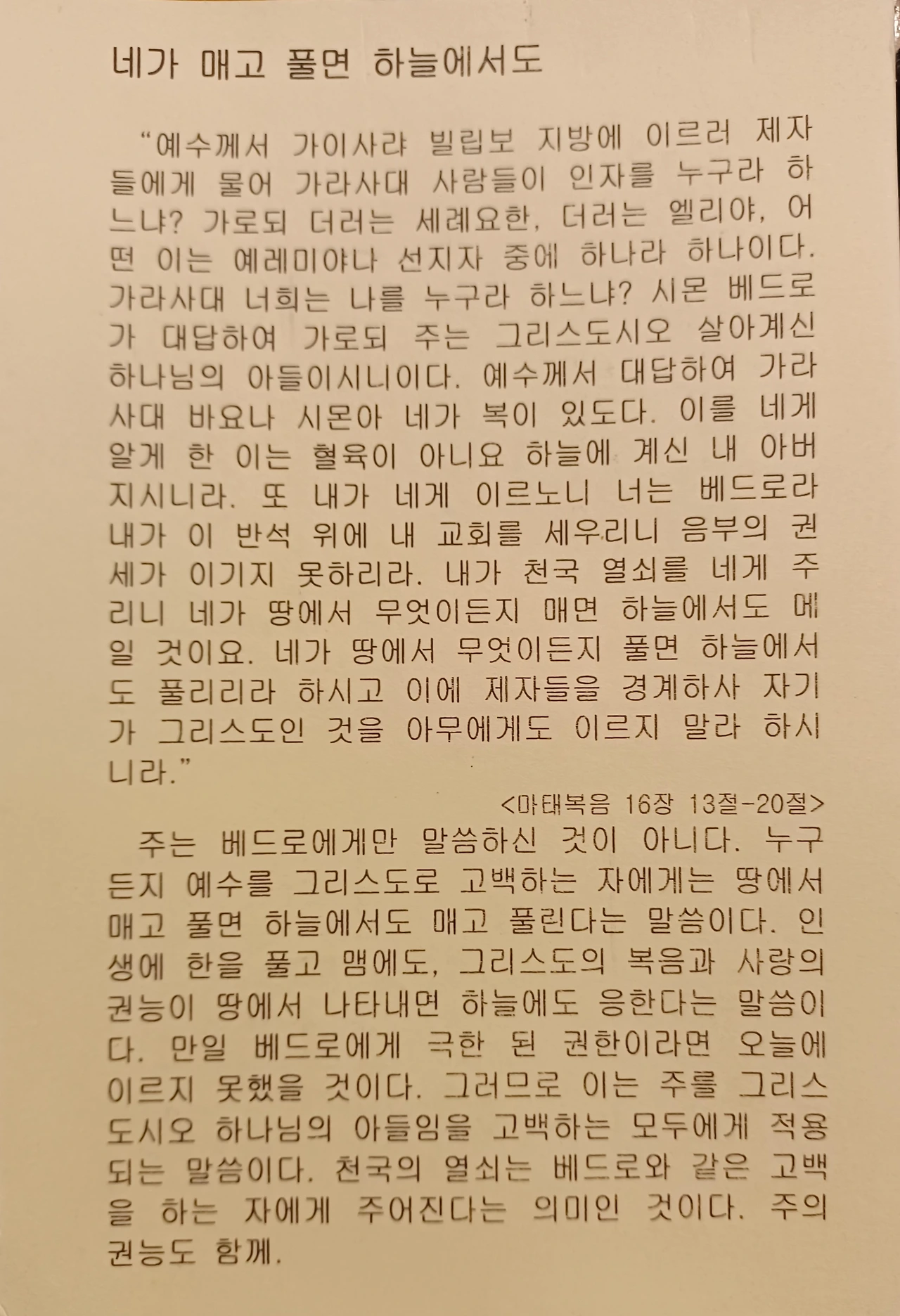인본주의 종교란? 인간 중심의 종교를 말한다. 즉 특정 인간에 의해 인위적으로 어떤 이념과 사상으로 만든 것이다. 이런 종교엔 가상적 이적이나 설화적 이적 등으로 인간을 세뇌시켜서 마치 그럴 거란 망상을 우상화할 뿐이다. 이 모두는 비현실화 또는 공상적 의식을 심을 뿐이다. 그러나 성경은 사실임과 현존성을 증명해 준다. 그러므로 오직 성경만이 진리인 것이다. 그 외 것들은 인간이 꾸민 것들이다. 즉 영원할 수 없는 거짓된 진리인 것이다. 왜 이런 말을 먼저 하는 이유는 오늘의 엽서를 읽으면서 안타까운 마음이 들었기 때문이다. 성경을 믿는다는 대부분의 교인들(크리스천이라 부를 수 없는)은 교회를 다니면서 종교활동을 활발히 행하지만 진작 성경을 믿지 않는 이들이 너무나 많다는 것이다. 예수가 베드로에게 한 말은 생명력이 있으며, 진리인 것이다. 베드로가 고백한 말은 스스로 말한 것이 아니라, 성령이 그로 하여금 고백하게 한 것이다. 그런데도 예수는 시몬에게 말하기를, 너는 베드로라, 믿음의 반석이라, 네가 땅에서 뭐든 매면 하늘에서도 매고, 풀면 하늘에서도 풀린다. 이 말씀은 베드로에 극한 된 말이 아니다. 오늘날에도 살아있는 말이다. 지금, 현실에서도 이와 같이 베드로와 같은 고백을 하면, 현재도 매고 풀고 할 수 있다는 것이다. 그러한 믿음이어야 한다. 그 믿음이 무엇일까? 베드로와 같은 믿음이다. 유사한 믿음이 아니다. 즉 성령이 네게 임하면, 베드로와 같은 고백을 하며, 지금도 이런 믿음이 땅에서 매면 하늘에서도 매고, 풀면 하늘에서도 풀린다는 것이다. 그러므로 살아있는 믿음이어야 한다.인본주의적 신관이 아니라 성령이 역사하는 신앙이어야 한다. 신앙관이란 이념적 신앙을 의미함을 주의해야 한다.