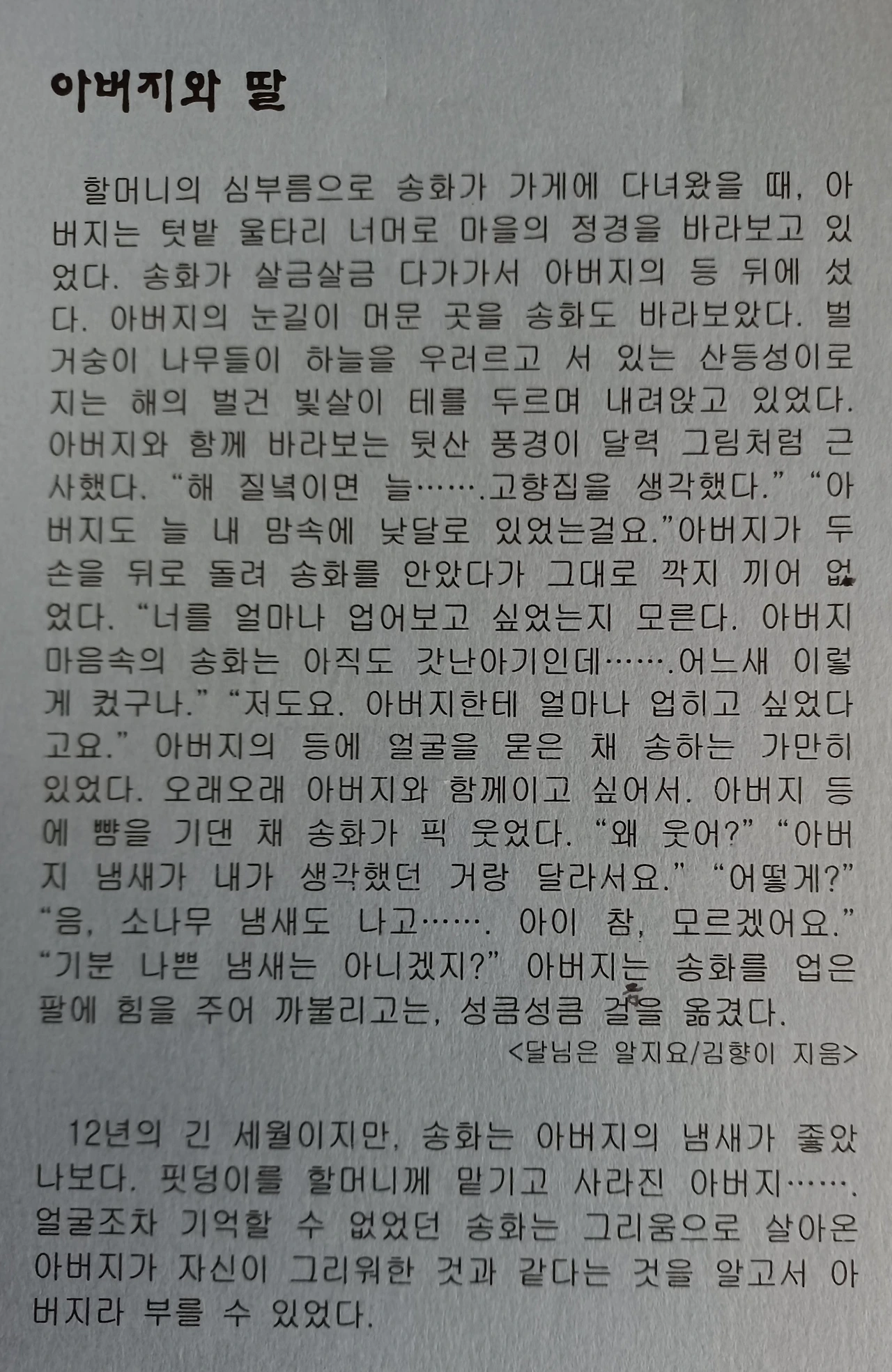 오래전에 표지와 제목이 마음에 들어 손에 들고 읽었던..."달님은 알지요"- 김향이의 동화... 다시 엽서로 읽으며 감동의 물결이 일어난다. 육이오 전쟁으로 얼마나 많은 사람들이 죽고, 고향을 잃고, 부모와 자식을 잃었던가? 요즘의 아이들은 이런 동화에 어떤 생각을 할까? 아마도 외면하겠지... 슬픈 이야기나 불행한 이야기를 싫어하겠지... 얼마나 불행과 슬픔에 두려움이 컸으면... 아예 거들떠볼려고도 하지 않겠지.. 아픔을 잊지 않음은 그리움이 있어서다. 누가 아픈 과거를 좋아하랴? 하지만 그 아픔 속에는 값진 사랑과 진실이 있기에 잊지 못하는 거지. 송화는 무당 할머니랑 살아왔다. 송화에게는 유일한 친구가 자연의 있는 것들이었다. 그런 송화에게 같은 아픔을 갖고 있는 친구가 있었다. 그리고 돌아온 아버지... 늘 그리던 아버지의 냄새... 송화는 아버지의 등에서 그 냄새를 맡았다. 송화의 웃음.. 그 속에 모든 답이 있었던 거다. 그래서 송화는 아버지라 부를 수 있었다. 이처럼 인간은 그 아버지를 그리워하며 살아가는 거지. 물론 아예 포기하고 사는 인간도 있지만.. 그렇게 포기하며 오랜 세월을 살다 보니, 아버지를 완전히 잊고 사는 인간도 있는 거지. 참 잔잔한 내 영혼을 촉촉이 적셔주는 동화이다.