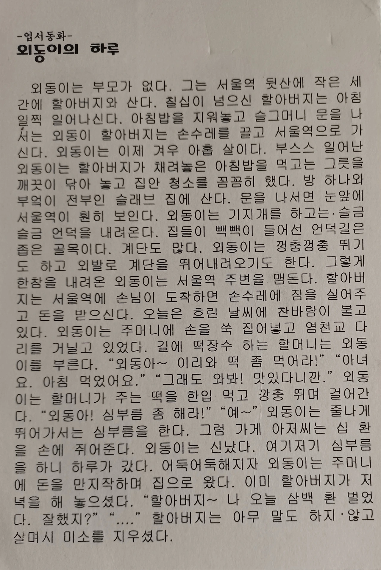 묶음 엽서를 꺼내어 한 장 한 장 읽다가 '외동이의 하루' 란 제목의 동화를 다시 읽어보며... 옛 서울역의 모습이 선명하게 내 눈에 들어왔다. 지금은 찾아볼 수 없는 서울역이 되었다. 염천교 다리 끼고 줄비하게 있던 판자 가게들... 거기엔 신기한 물건들이 많았다. 특히 군화와 군복과 군모가 인상적이었다. 역 주변에는 떡장수 아주머니도, 지게꾼 아저씨도, 손수레 할아버지도 흔하게 보였다. 기차가 들어오면.. 요란하게 기적을 울리며 시커먼 연기를 뿜어낸다. 그래서인지 서울역 주변은 연탄공장처럼 시커멓다. 구두닦기 아이들도 줄비했다. 거지들도 줄비했다. 지금 생각하면 사람 냄새가 물신 나는 풍경이었다. 외돌이는 그런 곳에 씩씩하게 자랐다.