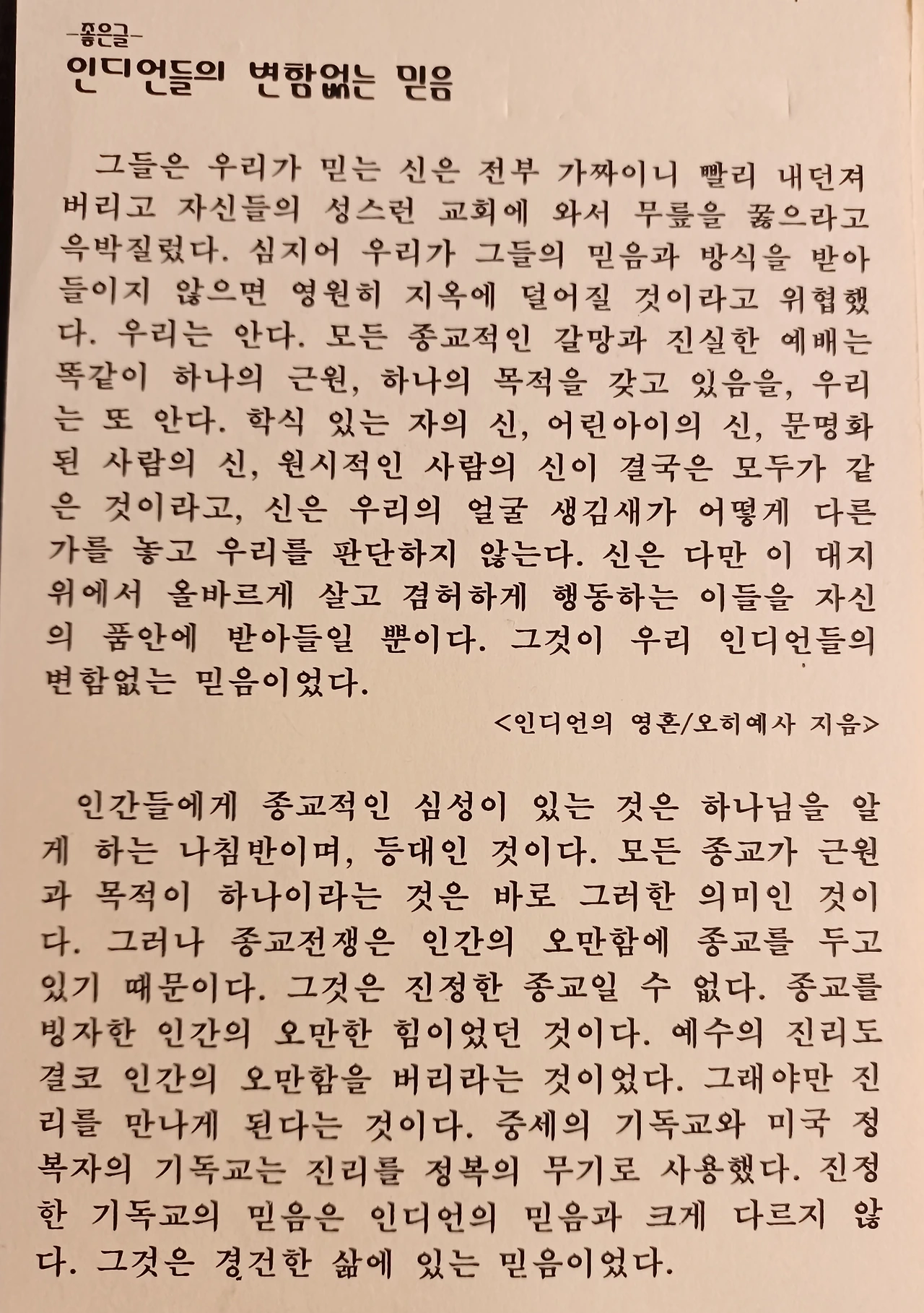 난 감격을 했다. 결국 우린 한 혈통이란 것이 아닌가? 나도 공감한다고 했다. 인디언의 전설적인 동물은 곰이라 한다. 우리나라도 단군신화에서 곰이 나온다. 이 또한 같은 의식이다. 그런 민족이다. 언제부터 이들을 인디언이라 불렀나? 이들의 근본 이름은 사라져 버렸다. 사실 이들은 인디언이 아니었다. 어떻든 이들도 종교가 있었다. 자세히 들으면 우리나라의 오래된 종교와 유사하다. 사실 고조선부터 내려온 종교는 변질되고 살아진 셈이다. 최근의 조선시대의 유교(중국에서는 종교로 여기지 않음, 사상) 문화로 조선식 조상숭배 종교가 있다. 그전에는 불교문화가 종교로 지배해 왔다 근대 후반에 와선 기독교가 종교로 자리를 잡았다. 그러나 자세히 살펴보면, 순수 기독교는 아닌 셈이다. 유교와 불교에 의식이 깔려있는 기독교라 함이 정확할 것 같다. 그래서 한국 기독교에는 기복신앙이 거의 차지하고 있는 것이다. 그러나 인디언의 영혼 속에 있는 신과 타 종교의 신에는 같은 근원을 가진다고 말한다. 즉 올바르게 살고 겸허하게 행동하라는 종교성은 같다는 것이다. 그러나 기독교나 유대교는 종교가 아닌 것을 알아야 한다. 왜냐하면, 종교는 인간에 의해 만들어지고 형성된 것이나, 기독(교)과 유대(교)에는 종교가 아니라 진리, 그 자체인 것이다. 즉 성경과 모세오경은 설화나 신화가 아니다. 오직 사실(팩트)인 것이다.