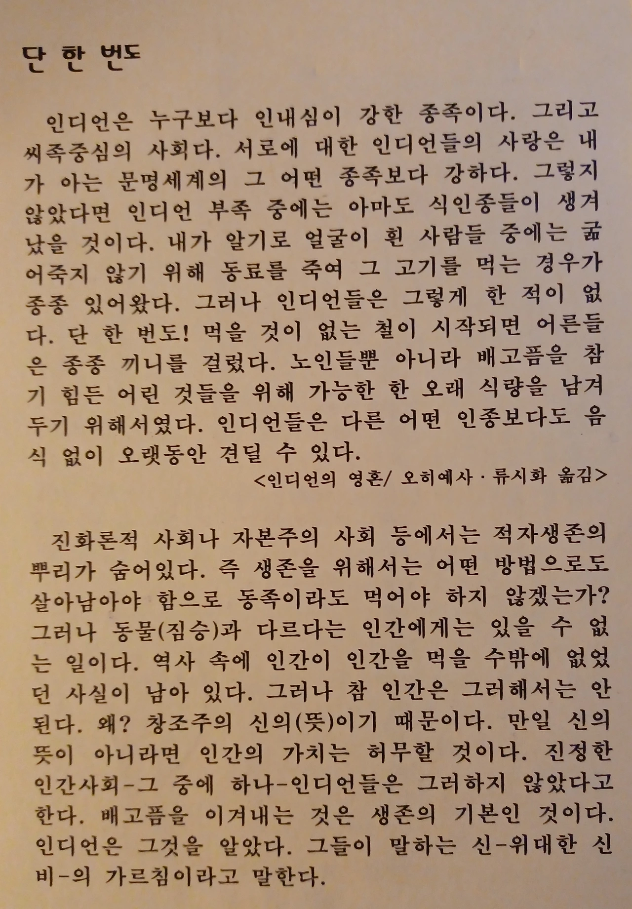 사람이라고 말하기조차 받아들일 수 없는 짓, 인간을.. 흔히 아프리카 하면 식인종을 연상케 했던 7,80년대에 인식들, 언젠가 책을 통해 그 이류를 알게 되었다. 그들은 가족이, 부모가 죽으면 장례절차상 부모의 몸을 자신에게 모신다는 의미로 죽은 부모의 시체를 먹었다는 것을 알았다. 참 끔찍한 일이나 그들의 전통적임을 안 후에 아프리카인은 식인종이 아님을 인정하게 됐다. 그러나 중국인은 달랐다. 전쟁을 한 후 승자 왕과 장수들이 패자 왕을 잡아먹음으로 승리를 완성했다는 역사적 기록이 있다. 또한 유교의 창시자인 공자는 인육을 즐겨 먹었다고 한다. 특히 인육 장조림을 즐겼다. 그리고 모친의 생일에 인육국을 드렸다고 한다. 이에 반하여, 조선시대에 시모의 병환을 위해 며느리가 자신의 허벅지를 도려내어 고깃국을 드렸다고 왕이 극찬하고 상을 내렸다는 이야기를 교수들은 자랑하듯 가르쳤다. 이처럼 인육 음식이 보편적이었다는 의미이다. 동물들도 동족을 잡아먹지 않는다. 그게 자연의 섭리이다. 어찌 인간이 그럴 수 있을까? 지금도 중국엔 시체 공장이 운영되고 있다. 거기서 일한 탈북자의 증언이다. 각 나라에 인체 박물관에 제공된 실제 인간으로 된 박제가 어디서 공급되었겠는가? 인도에서도 간지스강 가에 화장터에서 목격한 사실로 타다 남은 부모의 시체 일부가 개들이 와서 뜯어먹어도 상주는, 자식은 내버려 두고 바라만 본다. 이러한 인간의 악이 보편화된 인도와 중국.. 이들의 사상과 종교관에 있다. 윤화설이나, 진화설에선 인간의 존엄성보다 자연(물질)의 일부로 본다는 것이다. 그러나 아브라함의 이방 여인의 자식들은 동으로 떠나라 하여 끝없이 이주해간 후손들에서 아메리칸( 백인이 명명한 이름)까지 이동해 갔던 이들 원주민을 인디언(백인이 명명한 이름)이라 불렀던 이들은 결코 인육을 먹지 않았다. 한편 한국인처럼 모성애가 매우 강하다. 노인을 우대하고, 자식을 극진히 아끼는 민족이었다. 그러므로 인디언은 자식을 위해 부모(어른들)는 배고픔을 이겨내는 훈련을 해왔기에 극한으로 인육을 절대로 먹지 않았다. 이들은 자신의 종교적 신의 뜻으로 받아들였던 것이다.